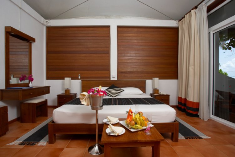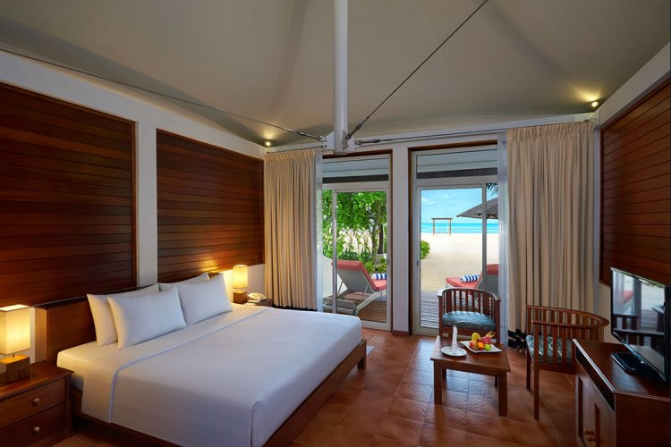 Beach bungalows are set amongst a backdrop of white sand and towering palm trees. Guests can feel secluded in their beach bungalow and unwind in idyllic paradise on a hammock.
