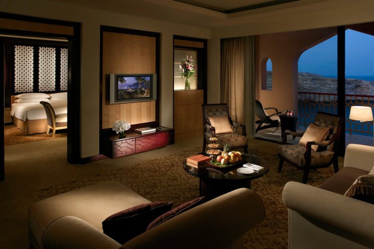 The rooms at the Al Husn are inspired by Arabian traditions with artwork created by local artistic and handcrafted furniture. Offering breathtaking views of the Gulf of Oman the rooms are spacious and allow you to have a relaxing stay.